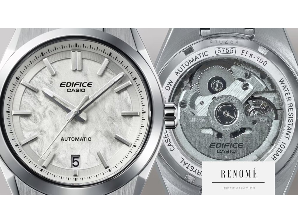 Casio Edifice Automatic EFK-100D-2AER jsou pánské automatické hodinky v klasickém stylu na ocelovém náramku s překlápěcí sponou. Pouzdro z nerezové oceli má průměr 39 milimetrů a průhledné dýnko. Modrý texturovaný číselník s ukazatelem data na šesté hodině je chráněn odolným safírovým sklíčkem. Ručičky jsou vybaveny luminiscenční vrstvou, která po nasvícení zajišťuje lepší čitelnost za zhoršených světelných podmínek. Hodinky pohání mechanický strojek 5755 s automatickým nátahem a rezervou chodu přibližně 40 hodin. Tento strojek s funkcí hackingu (zastavení vteřinové ručky při vytažení korunky do krajní polohy) je možné v případě potřeby natahovat i ručně. S vodotěsností 10 ATM jsou hodinky vhodné pro plavání i šnorchlování.